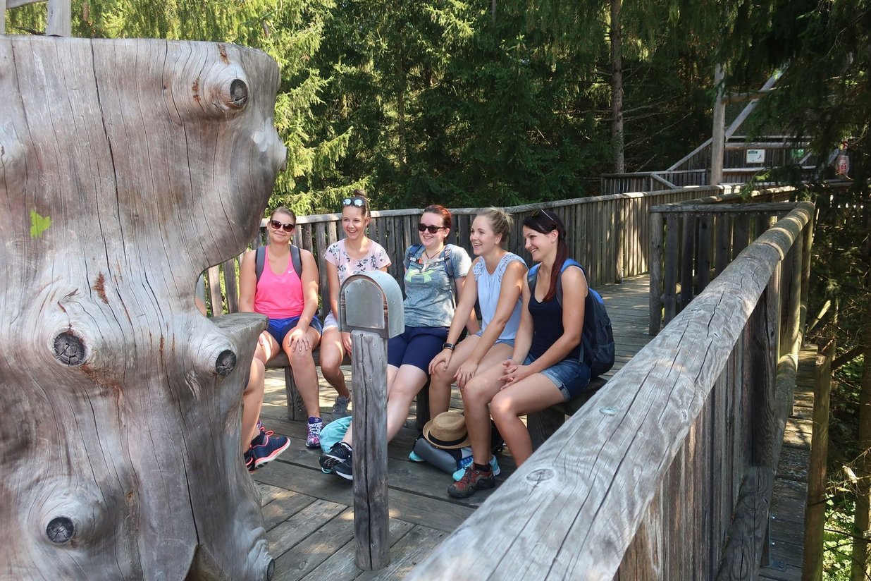 Gestartet sind wir um acht Uhr morgens - quer durch unseren Bezirk haben wir die Agrar & Genuss interessierten Jugendlichen der unterschiedlichen Ortsgruppen eingesammelt. Auf dem Weg ins wunderschöne Murtal wurden unsere Mitglieder schon im Bus mit Speckweckerl, Mohn- und Nusskronen von der Familie König genussvoll verwöhnt. Im Murtal angekommen besuchten wir zuerst den Wipfelwanderweg Rachau. Eine lustige, informative aber auch anstrengende Wanderung über die Wipfel der Rachau war für unsere Mitglieder genau das richtige. Gemeinsam hatten wir bei den unterschiedlichen Informations- und Spielestationen viel Spaß. Besonders der Märchenthron und die Kugelbahn haben uns begeistert und das Kind in uns wiedererweckt.